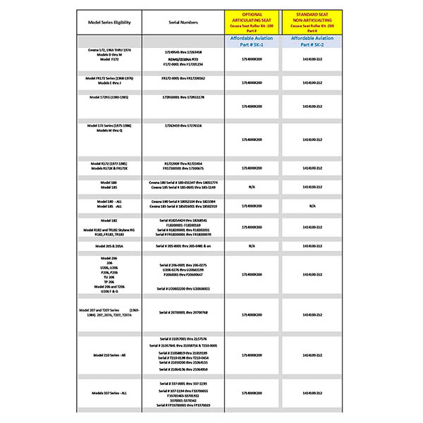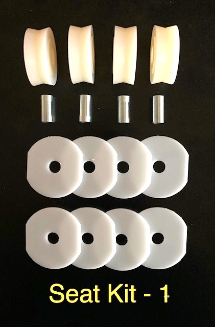 **These FAA-PMA replacement seat parts will assist you in complying with parts replacement requirements of A.D. 2011-10-09. This A.D. requires the periodic inspection and replacement of the seat components of the entire Cessna light aircraft fleet. These parts are direct replacements for the wear-related seat components.** One Seat Kit is used for each seat. It is recommended that both front seats are serviced at the same time. Affordable Aviation offers SEAT-KT-1 for use on all Cessna Fully Articulating Seats, (two crank handles). This LARGE roller has an approximate diameter of 1 3/8”. The kit contains NEW Nylon Rollers, NEW Steel Bushings and NEW Flat Acetyl Guide Washers which replace worn Cessna parts, allowing the front seat(s) to move easily fore and aft on the seat track rails. The kit contains the same components offered by Cessna, p/n 1714000K200 kits. All 177 Cardinals front seats will use the large seat roller and require this kit. The SK-1 Seat Roller Kit is not used on models 150-152. |