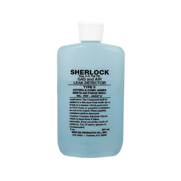 Sherlock Leak Detector is used for detecting leaks in pipe joints, tube connections, tanks or any system under gas or air pressure. It is very easy to use, simply wipe surface to be tested with a brush or dauber, squirt on with a squeeze bottle or spray with a trigger sprayer. Small leaks form white foam in 5 to 60 seconds. Large leaks form large bubbles almost instantly. Both Type 1 and 2 are neutral solutions that can be used in a pure oxygen environment, since they do not contain any oil, grease or other ingredients that might combine with oxygen to burn or cause an explosion. Meets MIL-PRF-25567E. Type II is for use from -65 degrees to +35 degrees Fahrenheit. |