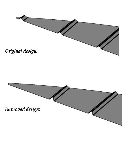 The process of forming that corrugation and then flattening it again work hardens the material, making it brittle and prone to cracking around the rivet. The precision hydraulic forming process allows the manufacturer to skip the final corrugation in the skin, leaving the problem tip unformed and ready to rivet. This is in contrast to Cessna's rotary forming process, which does not allow the option to skip a corrugation. |