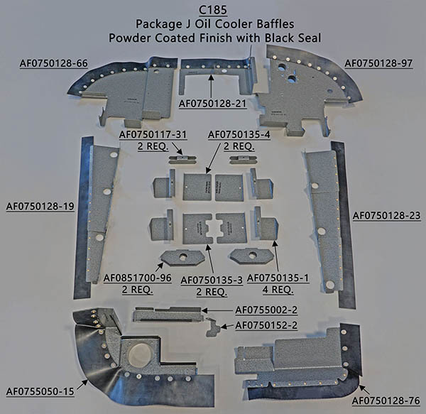 Package J: Bare aluminum P/N C185-PKGJ-BRBK or powder coat P/N C185-PKGJ-PCBK![]() Package K: Bare aluminum P/N C185-PKGJ-BRBK or powder coat P/N C185-PKGJ-PCBK ![]() *Photo represents bare coated baffles. Kits also available with powder coat. Standard and premium seal options available. Complete Engine Baffles KitsKeep your engine cool with new baffle kits! Airforms is the premier manufacturer of FAA-PMA replacement baffle kits for Cessna, Piper and the Beechcraft Baron.