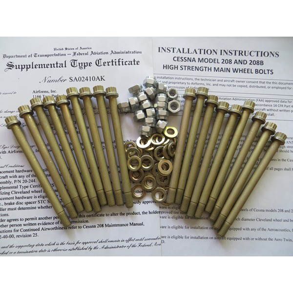 Cessna Caravan Main Wheel Bolts STC For Caravan operators who demand the most from their equipment High strength wheel bolts have been proven in the field to reduce fretting between wheel halves and provide an additional margin of safety for the wheel assembly. High strength MS21250 bolts replace the standard AN5 hardware that fasten the wheel halves and brake disc together. High strength nuts and countersunk washers are included with each kit. Replacement bolts come in two lengths to accommodate aircraft with and without brake disc spacers, and are eligible for aircraft equipped with or without, certain gross weight increase STCs. The high strength wheel bolts are approved for use with any of the Cessna 208/208B tire installations. The replacement hardware is eligible for installation only on the 10 inch diameter Cleveland wheel and brake assembly P/N 20-244, aircraft equipped with any of the Aeroacoustics Aircraft Systems, Inc. Caravan STCs, or on aircraft equipped with or without the Aero Twin, Inc. brake disc spacer STC SA02126AK-D.