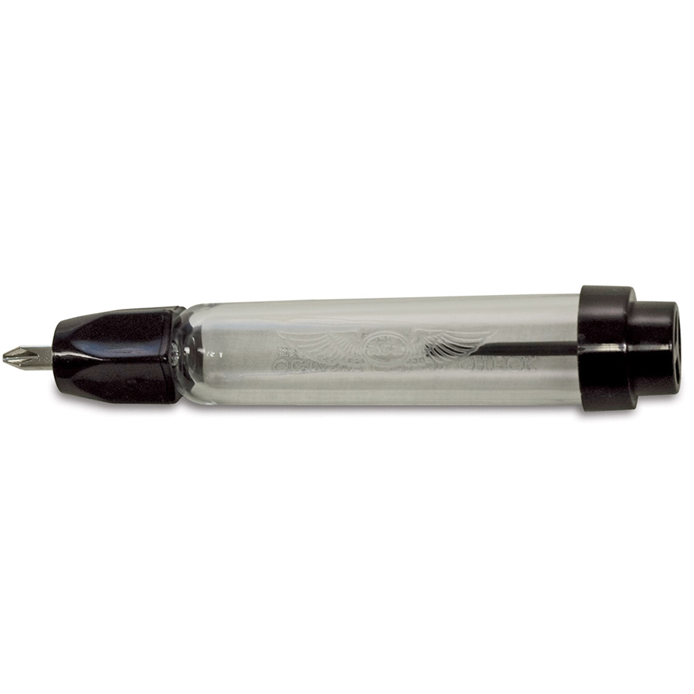 Protect yourself from fuel contamination by visually checking the fuel for water and debris. The unique snap on probe fits all quick-drain valves, stores compactly, and reduces spillage, loss, and probe breakage. The 4" (10.16 cm) transparent cylinder has the octane color-coding molded in the side for quick reference. Also includes a chrome-plated screwdriver blade with both a Phillips and a slotted head. |