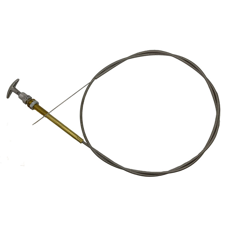 T-Handle dash control manufactured of duralumin and brass. Locks positively, will not vibrate loose. One-fourth turn locks it in any position and will hold up to 100 lbs. Standard travel 2-1/2". T-handle is 1-3/4" wide. Can be mounted from front or rear of instrument panel. Complete with wire and casing which may be shortened.