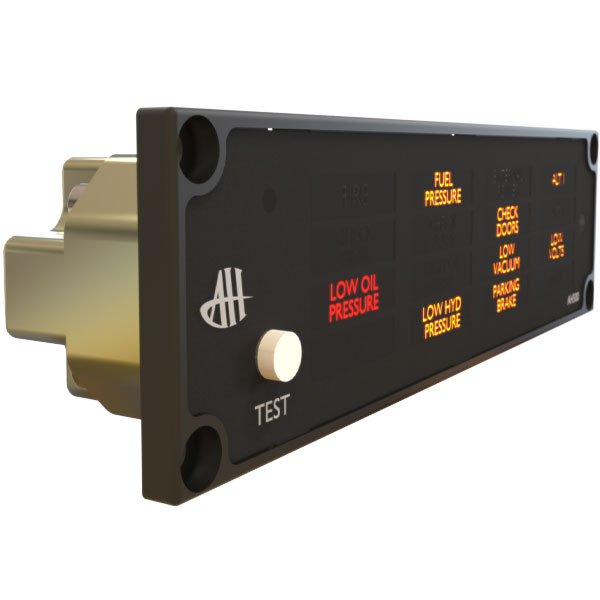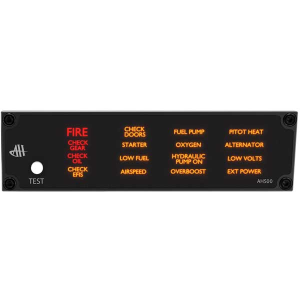 The AH500 combines flight, engine and aircraft configuration data to generate voice and visual alerts. The unit is programmed to warn off against switched, analog and EFIS data inputs based on the switched state, value threshold or combinations of inputs to generate envelope alarms. Envelope alerts could include oil pressure profiles, speed/ configuration envelopes, gear not down and oxygen alerts. Data is gathered from directly connected switches and analog inputs as well as being able to take flight and engine data from Electronic Flight Information Systems (EFIS) and Engine Monitors when available via serial buses. Alerts are mapped to custom voice and/or sunlight readable and auto dimming captions with integration to a remote Master Caution, Master Warning, and alert acknowledgment switch. The side mounted SD card allows for easy adjustment of programming and voice files. |