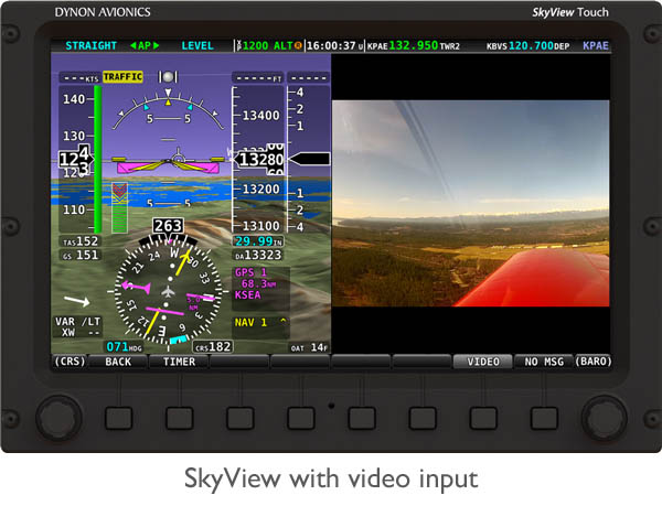 With SkyView 11 Software, all SkyView Touch and new SkyView screens can display video in both full-screen and split-screen formats when equipped with a Video Input Adapter. Video sources connect via s-video or composite input. Both NTSC and PAL formats are supported for worldwide compatibility. |