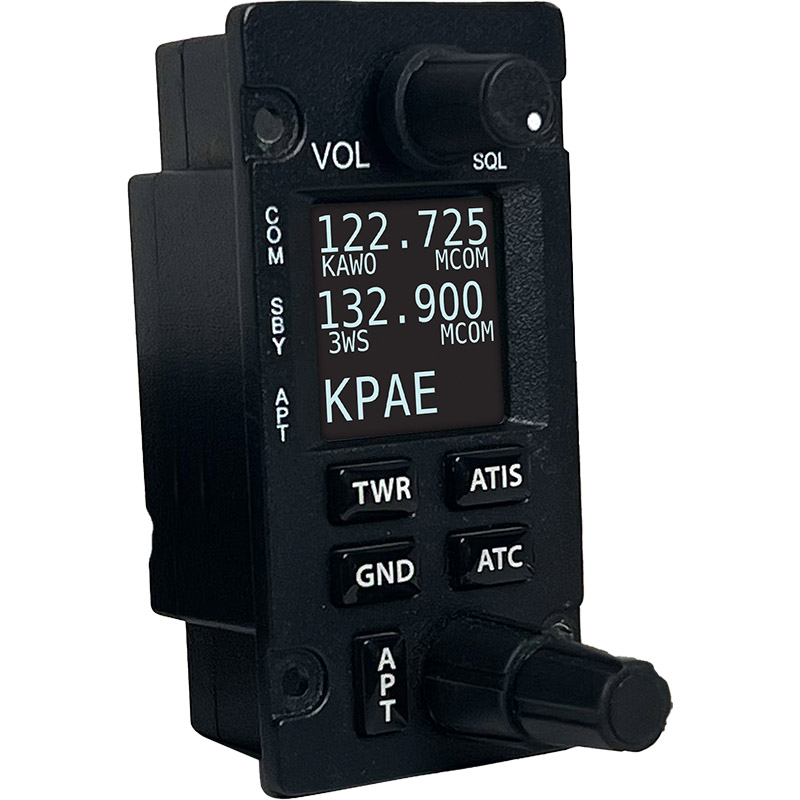 The SkyView COM Radio will change the way you use an aircraft radio. By integrating deeply with your Dynon SkyView system, the SkyView COM Radio tunes frequencies by airport and station type - rather than by spinning in a number - at the touch of a button. Dual watch allows you to listen for transmissions on both your active and standby frequencies simultaneously, with the active taking priority at all times. Use dual watch to monitor an alternate frequency in busy airspace or listen to ATIS without missing anything on the active. |