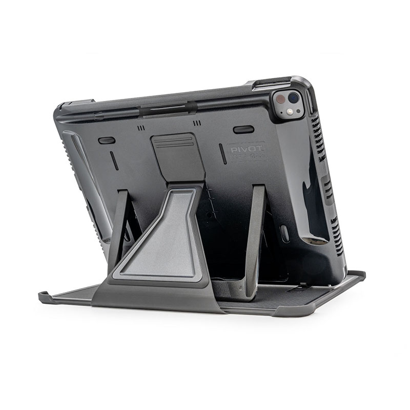 The PIVOT A27A is the newest large-format case from PIVOT that fits iPad Air 13-inch (M2), iPad Pro 13-inch (M4), and iPad Pro 12.9-inch (5th-6th gen) with updated design features to provide the best protection. Connect the A27A case quickly and securely to mounts and accessories using the patented PIVOT universal mounting system. Be confident with excellent 360-degree protection from drops, impacts, and scratches. The upgraded PIVOT Folio Cover provides full-coverage screen protection when in transit and increased impact resistance on corners and edges. Additionally, the Folio Cover offers quick-viewing support in landscape orientation with a selection of viewing positions. Use the Folio Cover in combination with the PIVOT Kickstand for viewing with enhanced stability and a wide range of adjustable viewing angles. The updated PIVOT Kickstand is thicker and reinforced with internal ribs and locking tabs for increased strength and offers 120-degrees of adjustability in landscape orientation, as well as table-top viewing in both landscape and portrait orientation. Includes Device Spacer, which fits into the case body to accommodate differences between device dimensions (for use with iPad Pro 13-inch (M2)only).