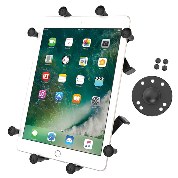 The RAM-B-202-UN9U consists of a composite spring loaded cradle, expandable grip arms, additional bottom support keepers and 1" ball base adapter. Included are extra easy access grip knobs, located on the back of the cradle for quick release of your tablet. The RAM-B-202-UN9U expands and contracts for perfect fit of most 10" tablets with or without sleeves, as well as some smaller tablets. The included 1" ball base includes hardware to attach directly to the back of the cradle and is compatible with all "B" size double socket arms.