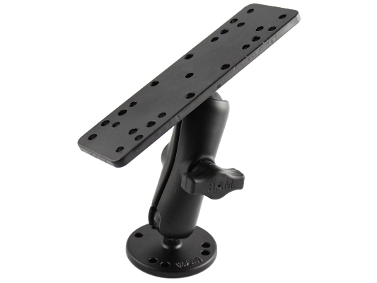 This product consists of a double socket arm, 2.5" diameter round base and 6.25" x 2" rectangle base. The round base contains pre-drilled holes, including the universal AMPS hole pattern. The rectangle base contains different combinations of pre-drilled holes which will match up to many electronic devices and mounts, including Marine GPS, CB Radios, Ham Radios, Gimbal Brackets and more.