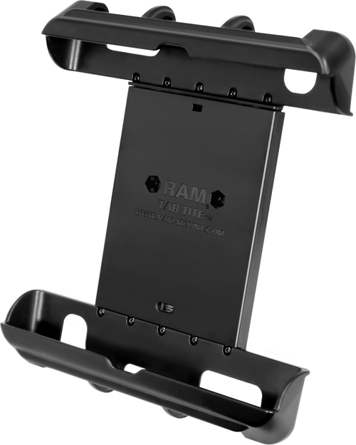 The RAM-HOL-TAB17U consists of a spring loaded back plate and custom support cups for 10" screen tablets WITH heavy duty cases. The spring loaded design makes it easy to load and unload your tablet, along with keeping it secure while on the go. Interchangeable cup ends are designed to optimize the functionality of your tablet, allowing access to audio jacks, usb, power, and other ports, your tablet can be used just as it was intended. Perfect for stationary or on the go applications, the RAM-HOL-TAB17U is just what you need to get the most out of your tablet. The RAM Tab-Tite™ cradle is compatible with the following tablets: 10" Screen Tablets with LifeProof nüüd cases 10" Screen Tablets with Lifedge cases 10" Screen Tablets with heavy duty cases The Tab-Tite™ cradle is compatible with any tablet or reader that will fit the dimensions listed below. It is important to verify the dimensions of your tablet when determining the overall size. |