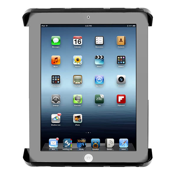 The RAM-HOL-TAB3U consists of a spring loaded back plate and custom support cups. The spring loaded design makes it easy to load and unload your tablet, along with keeping it secure while on the go. Interchangeable cup ends are designed to optimize the functionality of your tablet, allowing access to audio jacks, usb, power, and other ports, your tablet can be used just as it was intended. Perfect for stationary or on the go applications, the RAM-HOL-TAB3U is just what you need to get the most out of your tablet. The included backplate is interchangeable with various size support cups, making it compatible with numerous tablet models. New detachable support cups are the only components needed for purchase, attach to the backplate for support of your new tablet. Included is a set of four nuts and bolts to connect the cradle to any RAM components or mounts that contain the universal AMPs hole pattern. The Tab-Tite™ cradle is compatible with any tablet that will fit the dimensions listed below. It is important to verify the dimensions of your tablet when determining the overall size. Cradle Dimensions: Height: 8.5" to 11.125" Width: 6.38" to 7.75" Depth: 0.13" to 0.56" Note: Base adapter not included. |