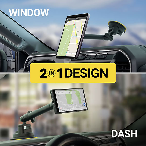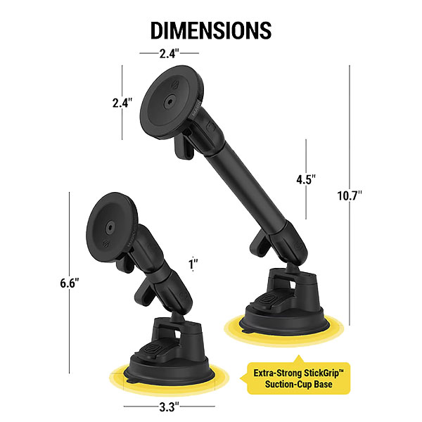 • Attach this rugged phone mount to your Window with the heavy-duty suction-cup base or Dash with the included 3.7 inch diameter adhesive pad.
