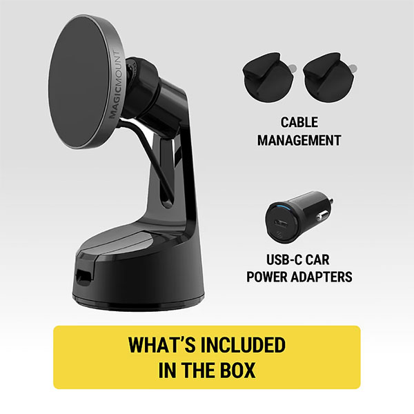 • Included: MagicMount Charge Pro Mount, 20W USB-C Power Adapter, Cable Management Clip, Alcohol Cleaning Wipe