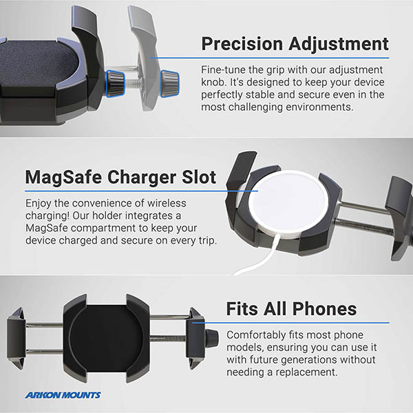 The SkyHold™ airplane mount, equipped with a 3.75" reinforced composite shaft, allows you to position your phone within your line of sight, keeping you focused on the horizon. Secure Airplane Phone Holder The SkyHold™ Yoke Clamp Phone Mount, equipped with Arkon's RoadVise® Ultra Holder, is designed to fit devices ranging from 2.52" to 5.71" wide, including Apple iPhone and Samsung Galaxy models. Its adjustable knob guarantees a perfect fit for your device. At the same time, the spring-loaded mechanism allows for easy phone attachment and detachment, ideal for busy pilots. Additionally, it features a recess specifically designed to accommodate the Apple MagSafe Charger or other Qi wireless charging systems, allowing you to charge in-flight. Adjustable Composite Shaft The SkyHold™ Yoke Clamp Phone Mount Mount features a 3.75" Robust™ mount shaft, providing full adjustability for perfect smartphone positioning while you take to the air. Secure your phone at your desired angle and lock it in place by tightening the knob on the ball ends, ensuring it stays within your eyeline and easy reach throughout your flight. Secure Yoke Clamp Arkon's Robust™ Clamp Mount with Security Knob firmly grips the steering yoke thanks to its innovative jaw design and extra-wide clamping range. This mount firmly attaches to various airplane yoke designs up to 2.75" wide, making it the perfect co-pilot for your daily flights. |