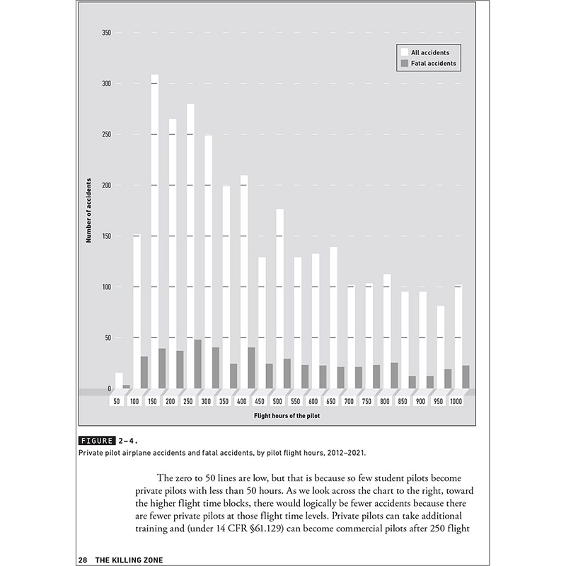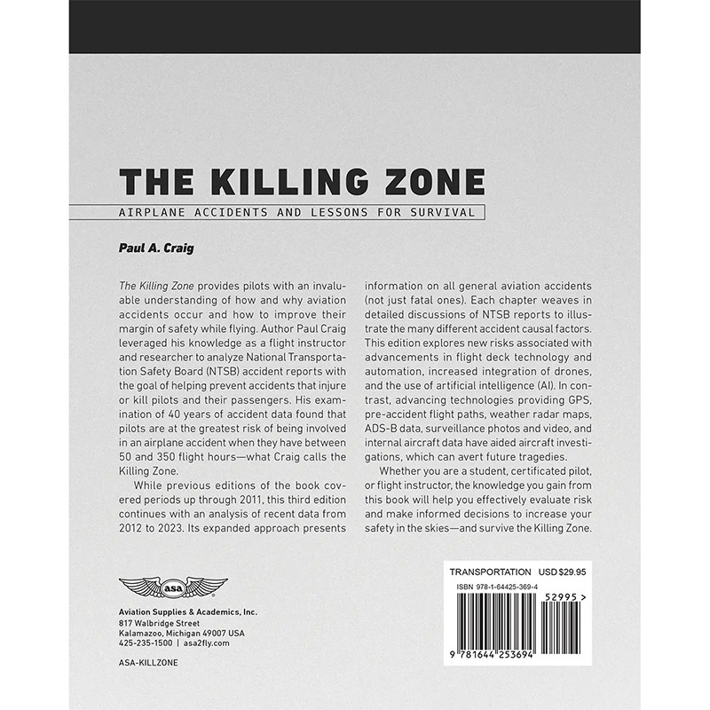 The Killing Zone provides pilots with an invaluable understanding of how and why aviation accidents occur and how to improve their margin of safety while flying. Author Paul Craig leveraged his knowledge as a flight instructor and researcher to analyze National Transportation Safety Board (NTSB) accident reports with the goal of helping prevent accidents that injure or kill pilots and their passengers. His examination of 40 years of accident data found that pilots are at the greatest risk of being involved in an airplane accident when they have between 50 and 350 flight hours—what Craig calls the Killing Zone. While previous editions of the book covered periods up through 2011, this third edition continues with an analysis of recent data from 2012 to 2023. Its expanded approach presents information on all general aviation accidents (not just fatal ones). Each chapter weaves in detailed discussions of NTSB reports to illustrate the many different accident causal factors. This edition explores new risks associated with advancements in flight deck technology and automation, increased integration of drones, and the use of artificial intelligence (AI). In contrast, advancing technologies providing GPS, pre-accident flight paths, weather radar maps, ADS-B data, surveillance photos and video, and internal aircraft data have aided aircraft investigations, which can avert future tragedies. Whether you are a student, certificated pilot, or flight instructor, the knowledge you gain from this book will help you effectively evaluate risk and make informed decisions to increase your safety in the skies—and survive the Killing Zone. |