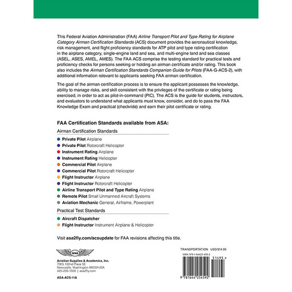 This Federal Aviation Administration (FAA) Airline Transport Pilot and Type Rating – Airplane Airman Certification Standards (ACS) document provides the aeronautical knowledge, risk management, and flight proficiency standards for airline transport pilot (ATP) certification in the airplane category, single-engine land and sea, and multi-engine land and sea classes (ASEL, ASES, AMEL, AMES). This ACS includes the Companion Guide (FAA-G-ACS-2) and supercedes ACS-11.1. The ACS is the guide for students, instructors, and evaluators to understand what applicants must know, do, and consider to pass their FAA Knowledge Exam and practical (checkride) and earn their pilot certificate or rating. |