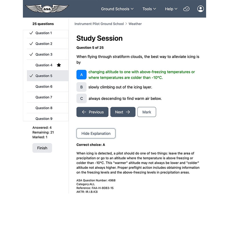 Prepare for the FAA Knowledge Exam and the cockpit, online with this on-demand solution from ASA. From the cloud, to you. Anytime. Anywhere. On any internet-connected device. Gain the aeronautical knowledge required to become a safe and competent instrument-rated pilot with this on-demand solution from ASA. With ASA’s time-tested and trusted content, this convenient on-demand solution is effective for self-study and the organization makes it an easy addition to any classroom-style ground school. The comprehensive curriculum consists of lessons featuring internet-based evaluation, resources, and course tracking, supported with professional multi-media presentations from the leaders in aviation training. Read: ASA's Instrument Rating Test Prep (online) and The Pilot's Manual: Instrument Flying (online) Watch: ASA Instrument Pilot Virtual Test Prep…Nearly 10 hours of video presentations Study and Prepare: Study FAA questions with answers, explanations, and review modes from Prepware and take practice tests to obtain your FAA Knowledge Exam endorsement Course Contents: Introduction, Weather, Weather Services, Flight Instruments, Navigation, Regulations & Procedures, Departure, En Route, Arrival & Approach, and Test Tips. Also included: on-screen CX-3® Flight Computer, fully-searchable FAR/AIM and Instrument Rating Airman Certification Standards (FAA-S-ACS-8).. Complete the Instrument Pilot Online Ground School on all your internet-connected devices for the ultimate in flexibility. Log in from your desktop, laptop, smart phone, iPad or other tablet computer;the course knows where you left off regardless of which device you last used. Upon completion of the course and practice tests you'll receive your Endorsement letter and Graduation Certificate. Review all lesson components even after completion of the course to also serve as a refresher, with access available for 24 months (after course registration date). |