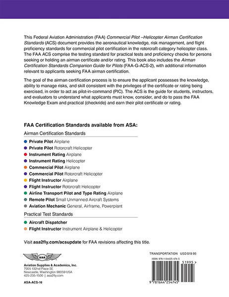 This Federal Aviation Administration (FAA) Commercial Pilot Helicopter Airman Certification Standards softcover book (ACS-16) supersedes the Practical Test Standards (8081-16B), and is the guide for students, instructors, and evaluators to understand what applicants must know, do, and consider to pass their FAA Knowledge Exam and practical (checkride) and earn their commercial helicopter pilot certificate in the rotorcraft category, helicopter class. This ACS includes the aeronautical knowledge, risk management, and flight proficiency standards necessary for certification, ACS codes, and the Companion Guide (FAA-G-ACS-2). |