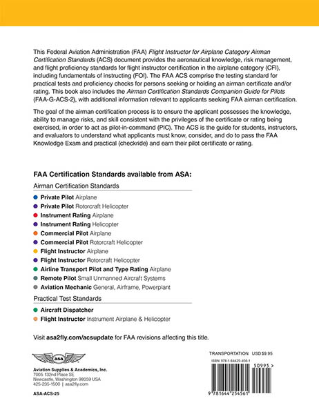 This Federal Aviation Administration (FAA) Flight Instructor Airplane Airman Certification Standards (ACS-25) supersedes the Practical Test Standars (8081-6DS and 8081-6DM), and is the guide for students, instructors, and evaluators to understand what applicants must know, do, and consider to pass their FAA Knowledge Exam and practical (checkride) and earn their flight instructor certificate in the airplane category, single and multi-engine land and sea (ASEL, ASES, AMEL, AMES) classes. Includes Fundamentals of Instructing (FOI) and Flight Instructor Airplane single-engine and multi-engine (CFI and MEI) tests. This ACS includes the aeronautical knowledge, risk management, and flight proficiency standards necessary for certification, ACS codes, and the Companion Guide (FAA-G-ACS-2). |