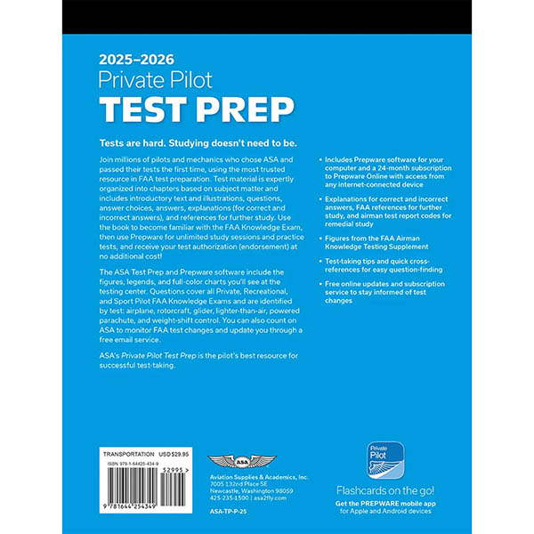 Tests are hard. Studying doesn’t need to be. Join millions of pilots and mechanics who chose ASA and passed their tests the first time, using the most trusted resource in FAA test preparation. Test material is expertly organized into chapters based on subject matter and includes introductory text and illustrations, questions, answer choices, answers, explanations (for correct and incorrect answers), and references for further study. Use the book to become familiar with the FAA Knowledge Exam, then use Prepware for unlimited study sessions and practice tests, and receive your test authorization (endorsement) at no additional cost! The ASA Test Prep and Prepware software include the figures, legends, and full-color charts you’ll see at the testing center. Questions cover all Private, Recreational, and Sport Pilot FAA Knowledge Exams and are identified by test: airplane, rotorcraft, glider, lighter-than-air, powered parachute, and weight-shift control. You can also count on ASA to monitor FAA test changes and update you through a free email service. ASA’s Private Pilot Test Prep is the pilot’s best resource for successful test-taking.