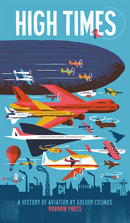 High Times A History of Aviation Respected Berlin illustrators Golden Cosmos celebrate the cultural history of flight in the latest title from Nobrow's popular Leporello series. A concertina book, High Times unfolds to reveal a bold fifty-four-inch panorama that can be read as a book, displayed on a mantelpiece, or framed as a beautiful print. With their trademark bold use of color and adeptness for shape and form, Golden Cosmos lovingly recall humanity's quest to conquer the skies. Featuring everything from Icarus' mythological attempts to the revolutionary innovations of the Jet Age and beyond, High Times is perfect for lovers of history, technology, and art alike. |