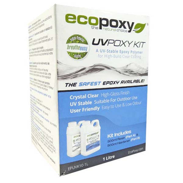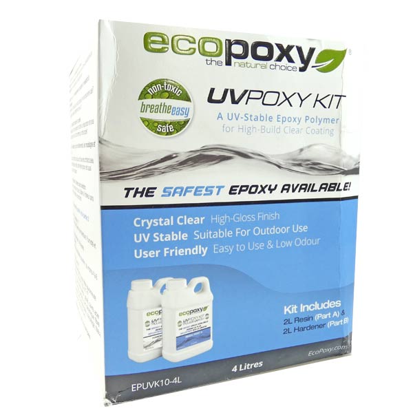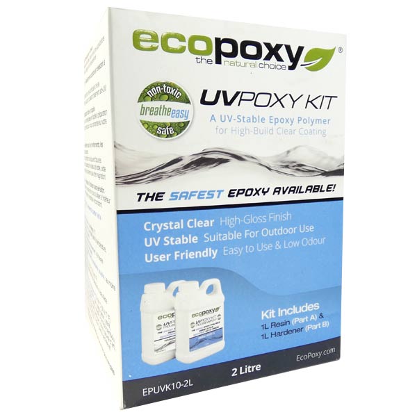 This UVPoxy Kit is a high performance two part system that is commonly used for table tops, bars, wood finishes, see-through clear casting, art work, layup, and other applications requiring a clear, strong coating. It cures to a crystal clear, high build, long lasting, glass-like finish, and will not blush or sweat under high humidity conditions. UVpoxy is designed to resist yellowing caused by the sun and other ultra violet light sources. |