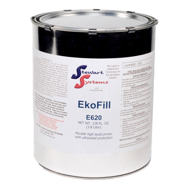 Secondly, EkoFill will fill minor imperfections and sand to a smooth, level finish. EkoFill can be used to fill and sand on fabric as well as composite. Thirdly, EkoFill as a primer provides an excellent surface for paint to adhere to. When properly sanded and cleaned, Stewart Systems EkoPoly Premium will bond to the EkoFill with extreme adhesion. EkoFill may be used on fabric, composite, wood, vinyl and many plastics. It is, however, not recommended for application on bare metal as it does not have corrosion inhibiting properties. Because EkoFill does not contain any metallic components, it will not interfere with radio reception or transmission allowing antennas to be mounted under fabric. The natural color of EkoFill is charcoal and therefore cannot be tinted to any other color. |