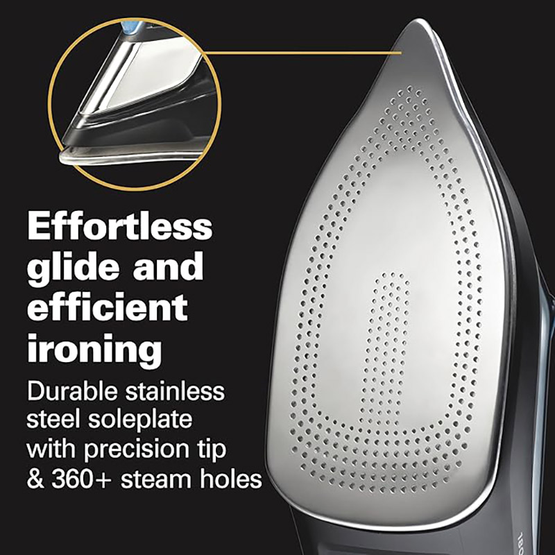 Keep your clothes looking smooth with the premium ironing performance of the Hamilton Beach® FabricIQ™ Steam Iron. It's loaded with innovative features to make ironing faster and easier than ever. On top of the handle, its intuitive FabricIQ™ touchpad lets you instantly select your fabric and temperature setting with one touch. As you iron, the durable stainless steel soleplate provides an effortless glide, and the precision tip easily reaches into tight spaces. Carefully arranged across the soleplate's surface are more than 360 steam holes, which ensure that fabrics are covered with wrinkle-releasing steam. When you need to iron a bunch of clothes without stopping or vertically steam hanging trousers or curtains, the extra-large water fill door and 350 ml water tank provide easy filling and fewer refills. The 10 foot pivoting cord gives you plenty of reach as you iron, and it's designed for both left- or right-handed ironing. Equipped with powerful steam blast, spray and vertical steam to tackle wrinkles on hanging clothes. Includes 3-way auto shutoff for peace of mind, anti-drip feature and self-cleaning function. |