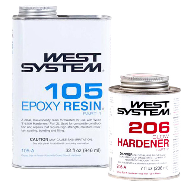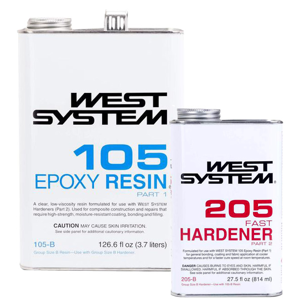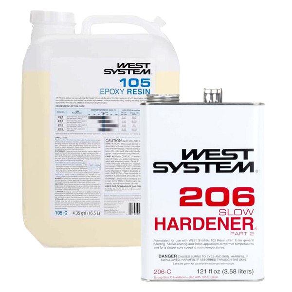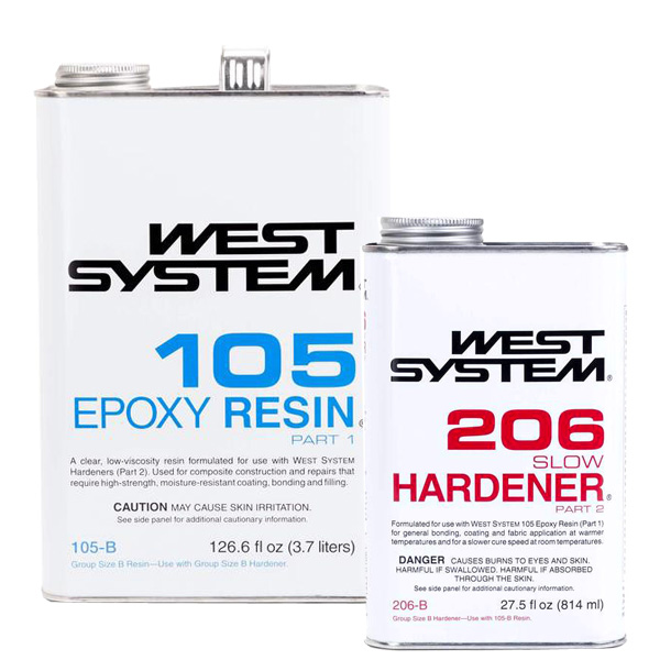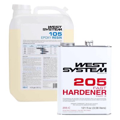 WEST SYSTEM brand resins and hardeners, form a two-part epoxy system developed by Gougeon Brothers specifically for wood and composite boat construction. Rutan Aircraft Factory now recommends WEST SYSTEM epoxy for certain homebuilt aircraft applications, particularly where a moisture resistant epoxy is desired. 105 Resin is the base material on which all of the WEST SYSTEM epoxy systems are built. The resin is a clear, light amber, low-viscosity liquid. It is designed specifically to wet out wood fiber. With roller applications, it possesses excellent thin film characteristics in flowing out and is self-leveling without fish-eyeing. Its relatively high flash point makes it safer to work with than polyesters. It can be cured in a wide temperature range, then sanded and shaped. It cures quite clear so that the natural finish shines through.