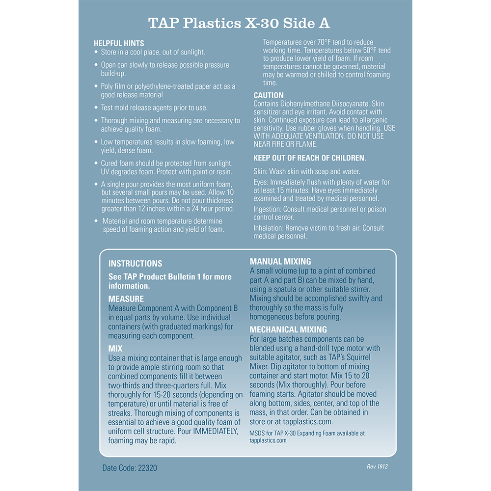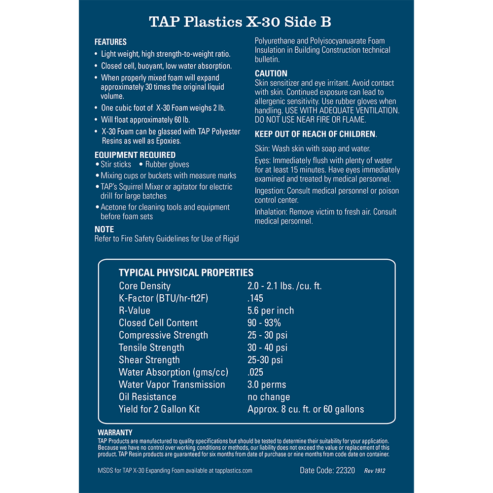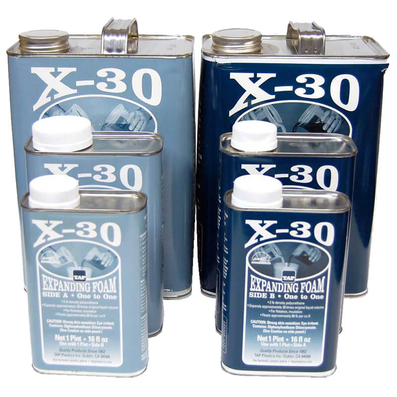 This system consists of two components - "X-30" Resin and "X-30" Catalyst. When the resin and catalyst are mixed in equal volumes they expand into a rigid closed-cell foam of 2 pound density. "X-30" Foam expands up to 30 times its liquid volume. Small-batch mixes are recommended. Cured foams can be easily trimmed, cut and shaped with common woodworking tools. Just mix equal amounts of Side A (Resin), and Side B (Catalyst), stir vigorously, and pour into an enclosed area¡Xleaving plenty of room for expansion. X-30 is unaffected by gasoline, oil, solvents or other petroleum products, and is ideal for pour-in-place buoyancy or insulation.