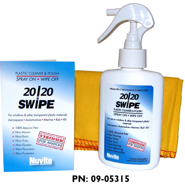 20/20 SWIPE’s easy spray on / wipe off application is fast and thorough. Lubricating oil, grease, soil, bird droppings and insect carcasses are wiped away with minimal pressure leaving a streak free, clear transparency. 20/20 SWIPE cleans without scratching and will not affect painted surfaces or other aircraft material. Its unique formula assures even coverage in sun or shade. Formulated specifically for aircraft transparent plastic windows, 20/20 SWIPE has been used on military aircraft for decades. Meeting MIL-C-18767A(ASG) and AMS 1535C specifications, 20/20 SWIPE is popular with many government agencies, and a favorite of helicopter pilots, air racers, and motorcyclists, among many others. Benefits Beyond Clean Regular polishing with 20/20 SWIPE delivers additional benefits. Its UV protectant formula inhibits UV induced crazing and discoloration. It also deposits an anti-static barrier prohibiting dust, ash, lint, and other atmospheric particulates from statically adhering to transparency surfaces. Additional Uses