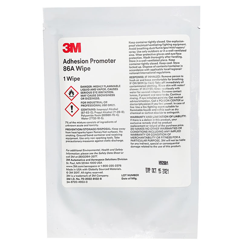 3M™ Adhesion Promoter 86A is a liquid “primer” designed to be used with 3M™ Polyurethane Protective Tapes and Boots and other acrylic adhesives to enhance initial adhesion in demanding situations. Available in a 16oz. can or a 7in x 7in transparent cloths. Intended for use in enhancement of 3M Polyurethane Protective Tape adhesion levels to certain types of surfaces. It is most effective when used over polyurethane enamel surfaces. |