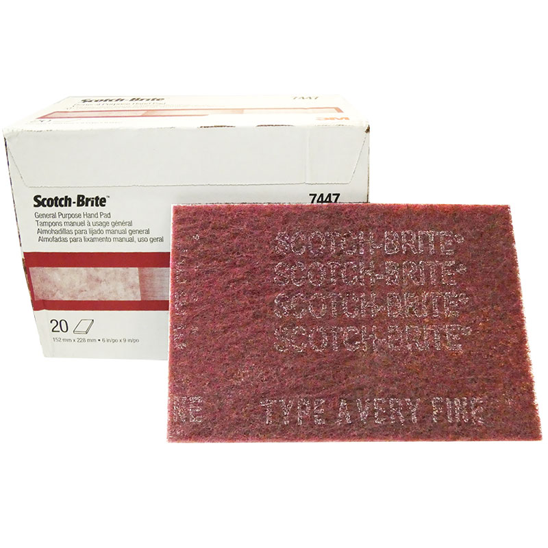 Scotch-Brite™ General Purpose Hand Pad 7447 combines flexibility with effective cutting action and precise hand control to accomplish tough cleaning jobs or produce fine finishing results, use after use. Very fine grade aluminum oxide abrasives cut fast and fine, leaving a smooth, finished surface. Suitable for use on a wide variety of materials and for many different tasks. |