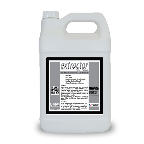 Nuvite Extractor is a professional-grade suction-type soil extraction machine cleaning fluid. Its deep cleaning action makes short work of cleaning both carpeting and heavy upholstery fabrics, and, it keeps machine fouling down due to its low foaming characteristic. The formulation includes color brighteners and a mild, fresh aroma without heavy perfumes. Additionally, Nuvite Extractor helps keep your extraction equipment clean and makes cleanup easy. When you meet those tough cleaning needs in industrial and commercial buildings, or in aircraft, RV, marine, auto and truck applications, you can't do better than Nuvite Extractor. Also works great with the popular small extraction machines and scrubbers for home upkeep use. Supplied in concentrate (1-2 oz. per gallon of water.) |
