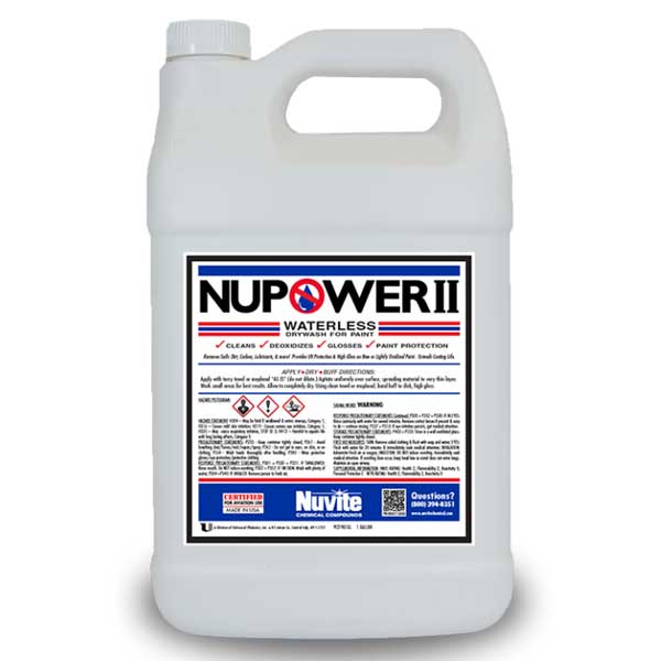 NuVite NuPower II is used for routine dry wash cleaning with gloss enhancement and UV protectant barrier. This is the easiest in-place dry wash clean and polish -with U/V protectant you've ever used! Cleans great and brightens paint colors by removing light oxidation, and leaves the shiniest and slickest surface you ever saw. Bugs almost fall off, and dirt won't stick like it did before. Cleans dirt, carbon and oil and leaves a protective barrier against UV deterioration of paint. Can also be used to clean non-polished bare metal surfaces. |