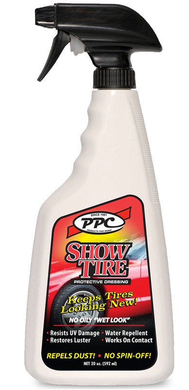 | Your vehicle looks great! But your tires look horrible – oily, greasy, turning brown, acting like a dust magnet. You’ve been using one of those inferior name brand "protectants", haven’t you? Did you know that these "protectants" actually cause a major safety issue – sidewall tire destruction – as government-funded studies have shown? With PPC’s SHOW TIRE, this problem is solved! Developed at the request of street rod enthusiasts, our product exceeds all others in producing "new tire" appearance with no oily silicone film to draw dust. Tires treated with SHOW TIRE require very little maintenance and do not exhibit sidewall destruction. The safe water-based formula spreads quickly and evenly to give complete coverage with no hassle. Just let dry and give a slight buff to reveal the awesome sheen! |