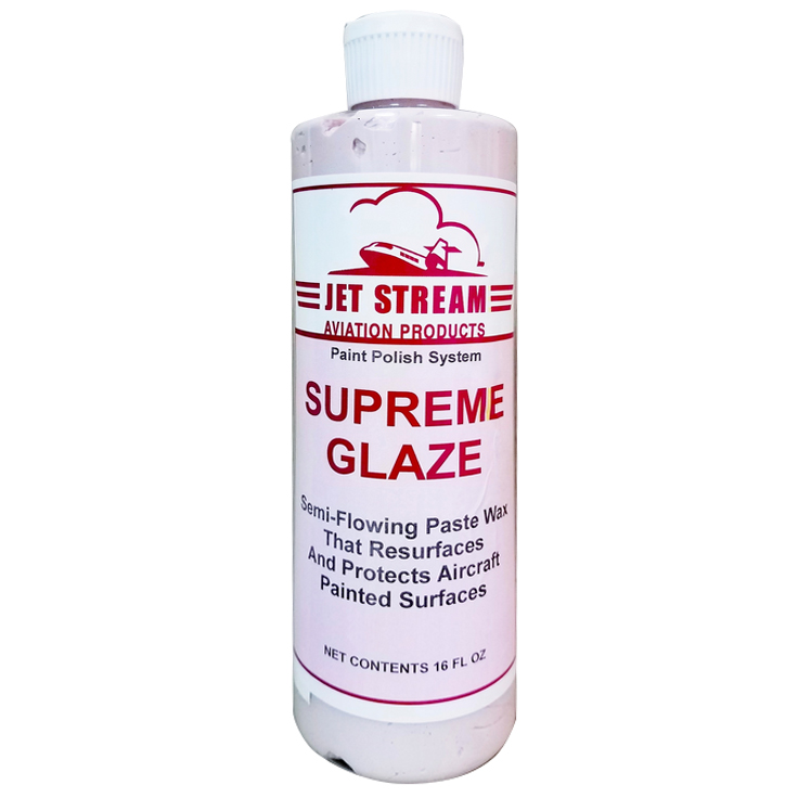 Supreme Glaze is a semi-flowing paste cleaner wax that cleans, shines, resurfaces, all aircraft painted surfaces while bringing out the brilliance of the original color. Supreme Glaze safely removes light to medium oxidation and scratches. Excellent for use on carbon exhaust stains associated with aircrafts such as King Airs. Supreme Glaze contains color brighteners and will protect against oxidation, salts, UV rays, hydraulic fluid, insect residue and acid rain. Can be used by hand or machine polisher. |