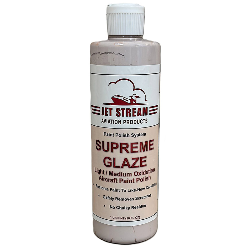 | Supreme Glaze will clean, shine, and protect all aircraft painted surfaces while bringing out the brilliance of the original color.Will safely remove light to medium oxidation and scratches. Excellent for use on carbon exhaust stains associated with aircraft. |