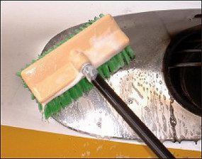 It is a 10” foam block that is completely filled with a one threaded green nylon. This brush will effectively remove oil, grease, exhaust fumes, and other oily residues. 60” length metal handle not included, order separately. |