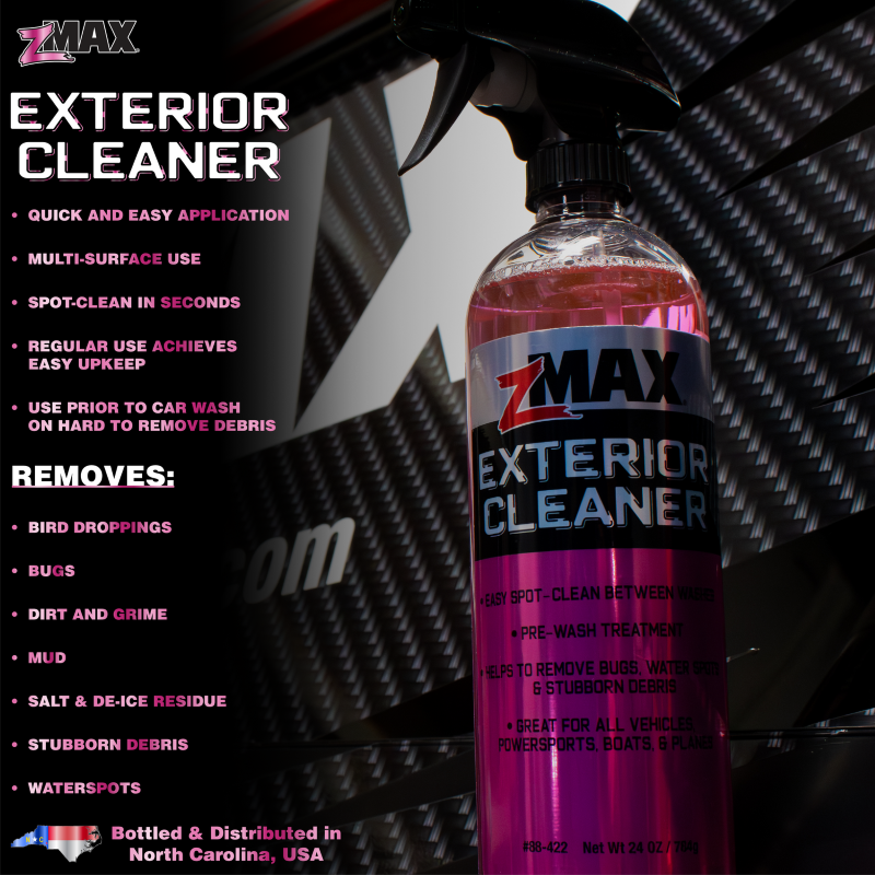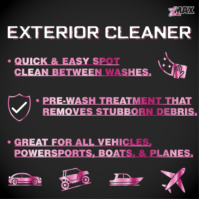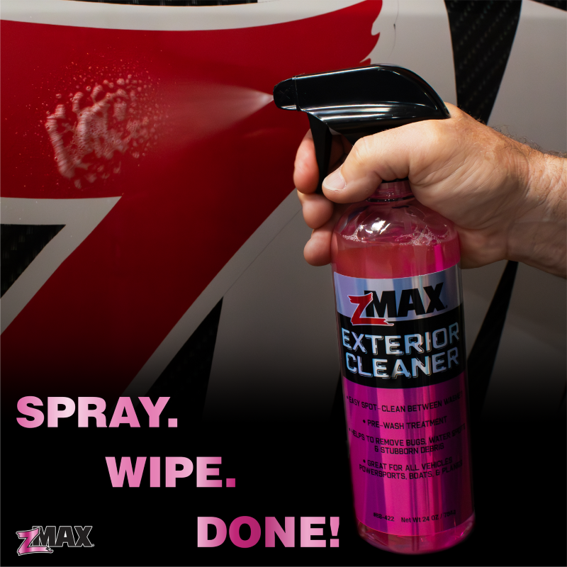 24oz. zMAX Exterior Cleaner is specially formulated to cut through stubborn debris with ease. Just spray, soak, and wipe away dirt, grime, mud, and bugs in no time. Use it as a powerful spot cleaner or as a pre-wash treatment to boost your regular cleaning routine. Great for all vehicles, powersports, boats, and planes. |