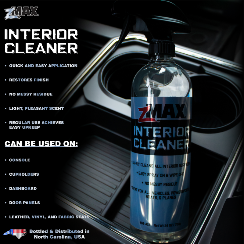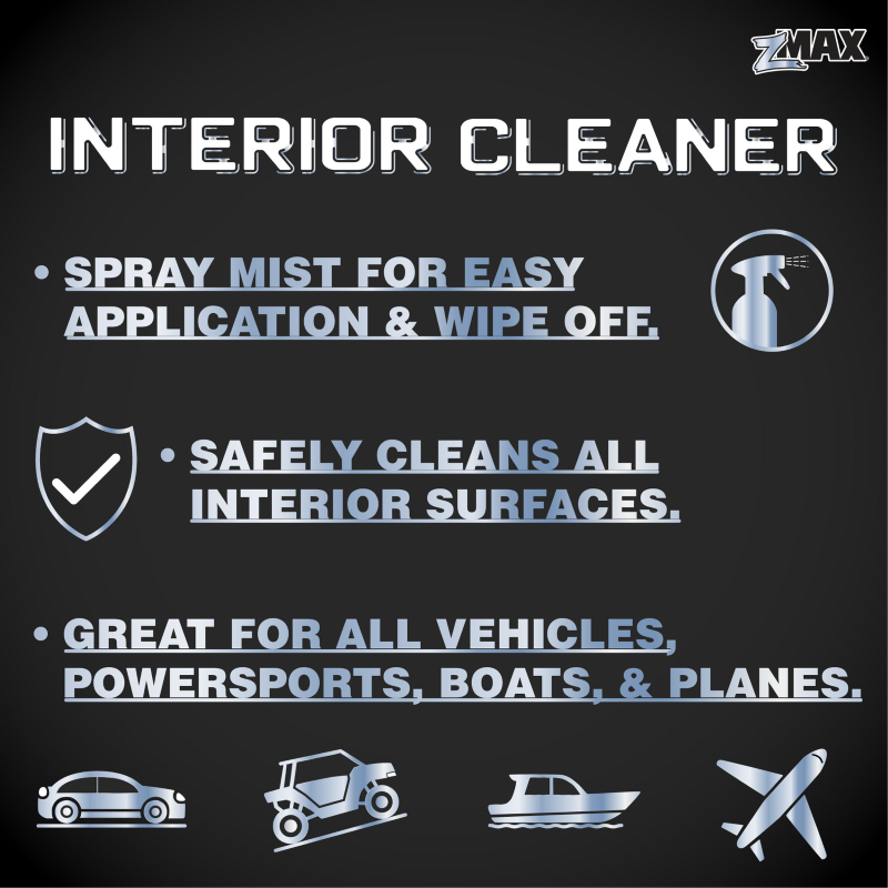 24oz. zMAX Interior Cleaner is specially formulated to clean and refresh all interior surfaces. Its light, pleasant scent complements a strong formula to effortlessly lift dust and everyday grime leaving a showroom finish with no greasy residue. Great for all vehicles, powersports, boats, and planes. |
