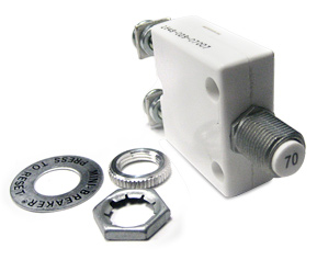 These heavy duty 70 AMP circuit breakers are ideal for use with aircraft alternators and other applications using high amperage. 10-32 screw terminals. 1 3/8" D x 1 3/8" H x 1/2" W. |
