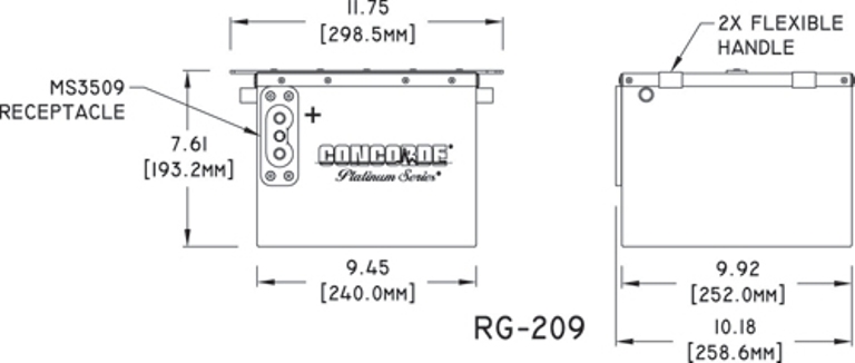 RG-209 is a lead acid aircraft battery housed in a powder coated aluminum cover and container with built in side vent tubes. Fabric lifting straps and stainless hold down bar attached to the cover.