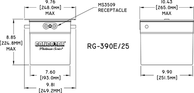 RG-390E/25 is a polypropylene battery with side vent tubes and a powder coated aluminum cover with hold down bar.