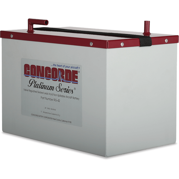 The RG-42 is a Concorde Platinum Series Aircraft Battery. The Platinum Series is comprised of premium hand made AGM Aircraft Batteries with excess power for many applications.PMA/TSO Recombinant Gas - The RGŪ Series are low resistance, valve regulated lead acid (VRLA) batteries.