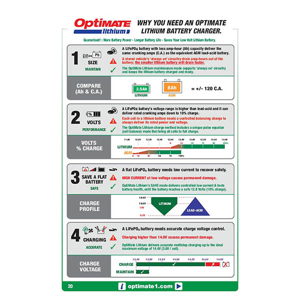 This Optimate Lithium charger will quickly charge your 24V battery, maintain it at the optimal voltage so it is ready to go when you are, but also has a feature of being a power source of 5 continuous amps! For example, you can use it as power supply while programming your aircraft EFIS or supply power to your car while retuning it. |
