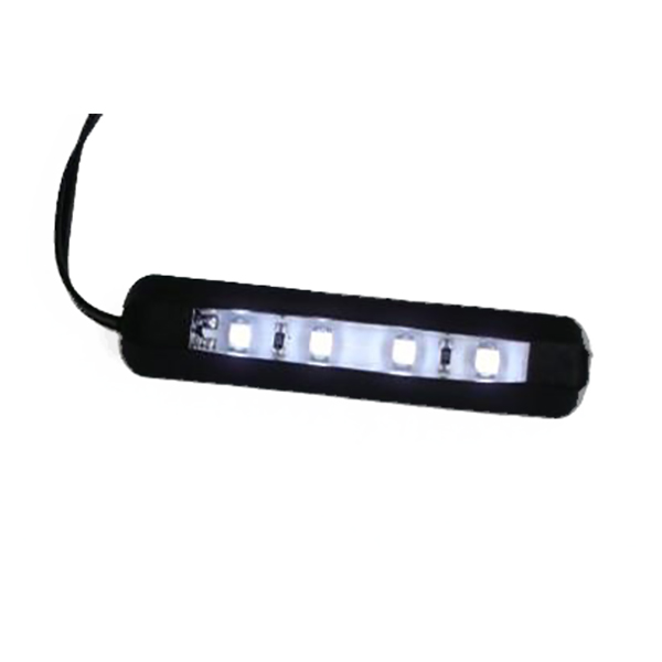 Per the manufacturer, this LED light is white in color. 5500 K temp. Low power, covers approximately 1 ft = 12" wide area.