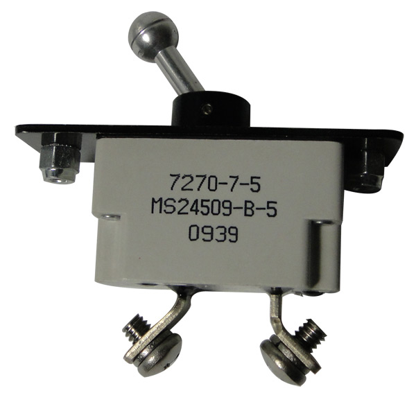 ground support equipment on either 120 VAC, 400 Hz or 30 VDC systems. The units are available with neck mounting (7270-1 and 7271-8) or standard cover plate (7270-7 and 7271-3). In each of these circuit breakers, the bi-metallic element assures uniform current distribution throughout its responsive area. This design reduces current density at the critical areas, resulting in an element having a much higher interrupting capability than conventional design. Inherently resistant to shock and vibration, the disc element is capable of precise calibration settings and will retain the initial calibration within close tolerances throughout the service life of the breaker. Both circuit breakers have conventional actuator action; i.e., the toggle actuator on the 7270 moves to the OFF position for trip indication and the button the 7271 pops out. A standard black button with a white collar is used. |