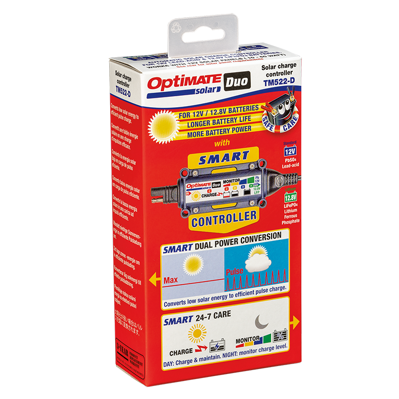 OptiMate Solar DUO, the smart 5 Amp solar controller that safely charges all types of 12V batteries – fully automatic ‘connect & forget’ technology! Works with 12V polycrystalline or mono-crystalline solar panels, with rated output from 10W to 60W. Solar Panel specifications Charges 12V lead-acid + 12.8V / 13.2V lithium batteries. The smart charge controller automatically adjusts charge according to battery type and condition – Connect to the battery and the OptiMate Solar DUO controller does the rest, no supervision required! The fully automatic multi-step program brings the battery safely to full charge and continues to maintain the battery daily – Charger by day! Battery’s state of charge is displayed on the LED panel 24-7 – Monitor by night! The controller kit includes premium quality components 1) OptiMate Solar DUO controller 2) O-27 SAE polarity converter 3) O-01 battery lead 4) O-04 battery clips – for the complete solar charging experience! |