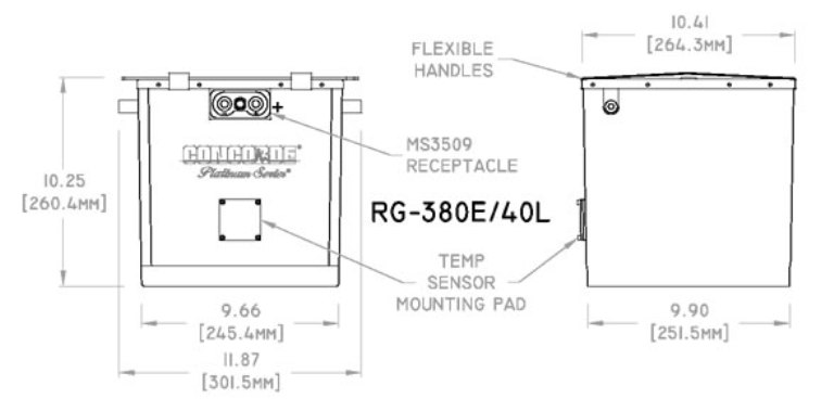 The RG-380E/40L is a Concorde Platinum Series Aircraft Battery. The Platinum Series is comprised of premium hand made AGM Aircraft Batteries with excess power for many applications. Description of the RG-380E/40L Aircraft Battery: Concorde recombinant gas (RGŪ Series) valve regulated lead acid (VRLA) batteries for engine starting, emergency / essential power, and standby power applications are constructed with cutting edge Absorbed Glass Mat (AGM) technology. Concorde VRLA-AGM batteries are well known for quality and their ability to perform reliably in hot & cold climates with superior engine starting performance and excellent charge acceptance. RG-380E/40L is housed in a fire resistant aluminum powder coated container with polypropylene side vent tubes and a temp sensor mounting pad. See BATTERY ACCESSORIES page for Concorde Temperature Sensors. Cover of powder coated aluminum with stainless hold down bar and fabric lifting strap. |